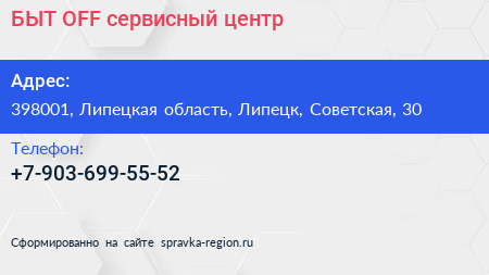 БЫТ OFF, сервисный центр по адресу 398001, Липецкая область, Липецк, Советская, 30 в дальнейшем Организация, размещена в следующих категориях:
