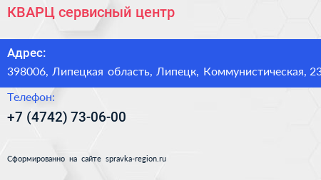 КВАРЦ, сервисный центр по адресу 398006, Липецкая область, Липецк, Коммунистическая, 23 в дальнейшем Организация, размещена в следующих категориях: