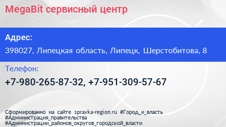 MegaBit, сервисный центр по адресу 398027, Липецкая область, Липецк, Шерстобитова, 8 в дальнейшем Организация, размещена в следующих категориях: