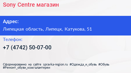 Sony Centre, магазин по адресу Липецкая область, Липецк, Катукова, 51 в дальнейшем Организация, размещена в следующих категориях: