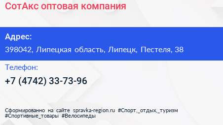 СотАкс, оптовая компания по адресу 398042, Липецкая область, Липецк, Пестеля, 38 в дальнейшем Организация, размещена в следующих категориях:
