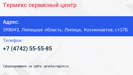 Термекс, сервисный центр по адресу 398043, Липецкая область, Липецк, Космонавтов, ст37Б в дальнейшем Организация, размещена в следующих категориях: