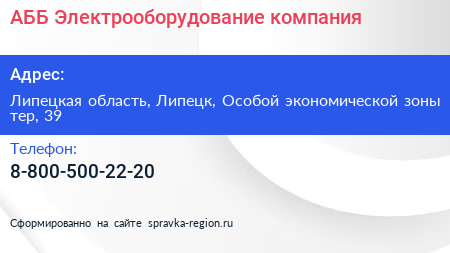АББ Электрооборудование, компания по адресу Липецкая область, Липецк, Особой экономической зоны тер, 39 в дальнейшем Организация, размещена в следующих категориях: