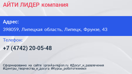 АЙТИ ЛИДЕР, компания по адресу 398059, Липецкая область, Липецк, Фрунзе, 43 в дальнейшем Организация, размещена в следующих категориях: