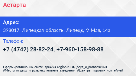 Астарта по адресу 398017, Липецкая область, Липецк, 9 Мая, 14а в дальнейшем Организация, размещена в следующих категориях: