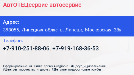 АвтОТЕЦсервис, автосервис по адресу 398055, Липецкая область, Липецк, Московская, 38а в дальнейшем Организация, размещена в следующих категориях: