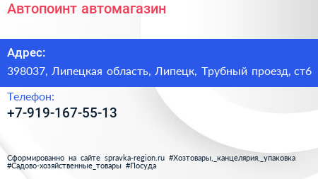 Автопоинт, автомагазин по адресу 398037, Липецкая область, Липецк, Трубный проезд, ст6 в дальнейшем Организация, размещена в следующих категориях:
