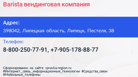 Barista, вендинговая компания по адресу 398042, Липецкая область, Липецк, Пестеля, 38 в дальнейшем Организация, размещена в следующих категориях: