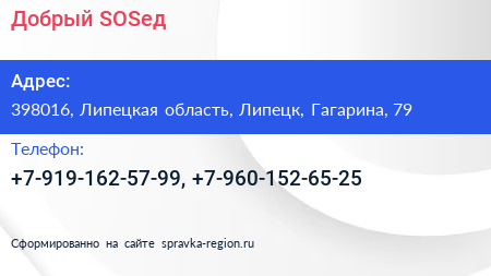 Добрый SOSед по адресу 398016, Липецкая область, Липецк, Гагарина, 79 в дальнейшем Организация, размещена в следующих категориях: