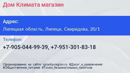 Дом Климата, магазин по адресу Липецкая область, Липецк, Свиридова, 20/1 в дальнейшем Организация, размещена в следующих категориях: