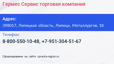 Гермес Сервис, торговая компания по адресу 398017, Липецкая область, Липецк, Металлургов, 18 в дальнейшем Организация, размещена в следующих категориях: