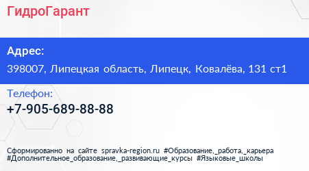 ГидроГарант по адресу 398007, Липецкая область, Липецк, Ковалёва, 131 ст1 в дальнейшем Организация, размещена в следующих категориях: