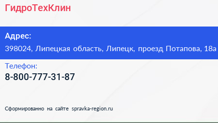 ГидроТехКлин по адресу 398024, Липецкая область, Липецк, проезд Потапова, 18а в дальнейшем Организация, размещена в следующих категориях: