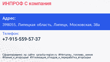 ИНПРОФ-С, компания по адресу 398055, Липецкая область, Липецк, Московская, 38а в дальнейшем Организация, размещена в следующих категориях: