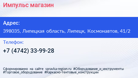 Импульс, магазин по адресу 398035, Липецкая область, Липецк, Космонавтов, 41/2 в дальнейшем Организация, размещена в следующих категориях: