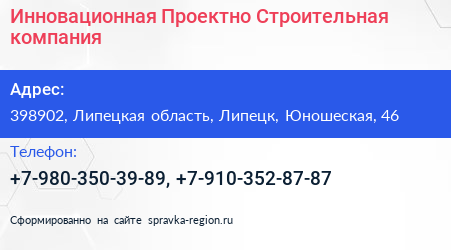 Инновационная Проектно-Строительная компания по адресу 398902, Липецкая область, Липецк, Юношеская, 46 в дальнейшем Организация, размещена в следующих категориях: