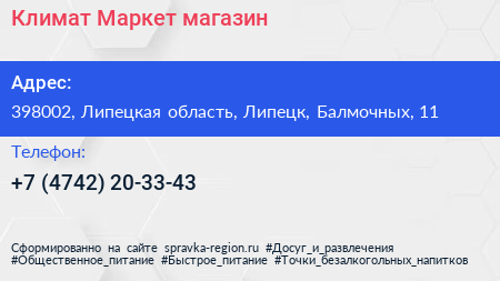 Климат Маркет, магазин по адресу 398002, Липецкая область, Липецк, Балмочных, 11 в дальнейшем Организация, размещена в следующих категориях: