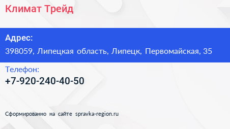 Климат Трейд по адресу 398059, Липецкая область, Липецк, Первомайская, 35 в дальнейшем Организация, размещена в следующих категориях: