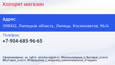 Колорит, магазин по адресу 398042, Липецкая область, Липецк, Космонавтов, 96/6 в дальнейшем Организация, размещена в следующих категориях:
