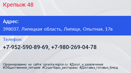 Крепыж-48 по адресу 398037, Липецкая область, Липецк, Опытная, 17в в дальнейшем Организация, размещена в следующих категориях: