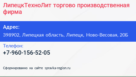 ЛипецкТехноЛит, торгово-производственная фирма по адресу 398902, Липецкая область, Липецк, Ново-Весовая, 20Б в дальнейшем Организация, размещена в следующих категориях: