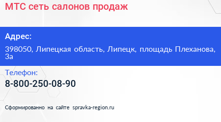 МТС, сеть салонов продаж по адресу 398050, Липецкая область, Липецк, площадь Плеханова, 3а в дальнейшем Организация, размещена в следующих категориях: