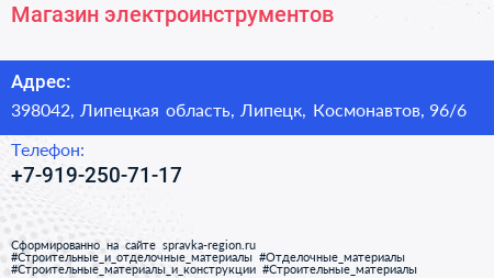 Магазин электроинструментов по адресу 398042, Липецкая область, Липецк, Космонавтов, 96/6 в дальнейшем Организация, размещена в следующих категориях: