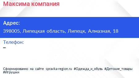 Максима, компания по адресу 398005, Липецкая область, Липецк, Алмазная, 18 в дальнейшем Организация, размещена в следующих категориях: