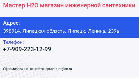 Мастер H2О, магазин инженерной сантехники по адресу 398914, Липецкая область, Липецк, Ленина, 239а в дальнейшем Организация, размещена в следующих категориях: