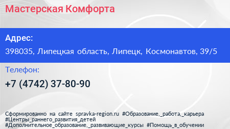 Мастерская Комфорта по адресу 398035, Липецкая область, Липецк, Космонавтов, 39/5 в дальнейшем Организация, размещена в следующих категориях: