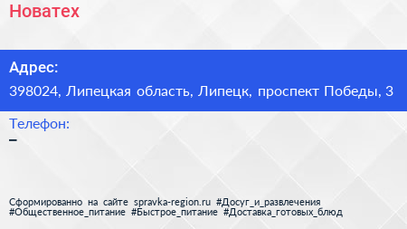 Новатех по адресу 398024, Липецкая область, Липецк, проспект Победы, 3 в дальнейшем Организация, размещена в следующих категориях: