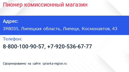 Пионер, комиссионный магазин по адресу 398035, Липецкая область, Липецк, Космонавтов, 43 в дальнейшем Организация, размещена в следующих категориях: