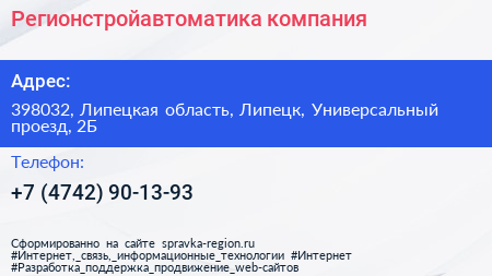 Регионстройавтоматика, компания по адресу 398032, Липецкая область, Липецк, Универсальный проезд, 2Б в дальнейшем Организация, размещена в следующих категориях: