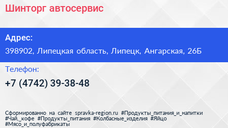 Шинторг, автосервис по адресу 398902, Липецкая область, Липецк, Ангарская, 26Б в дальнейшем Организация, размещена в следующих категориях: