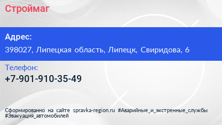 Строймаг по адресу 398027, Липецкая область, Липецк, Свиридова, 6 в дальнейшем Организация, размещена в следующих категориях: