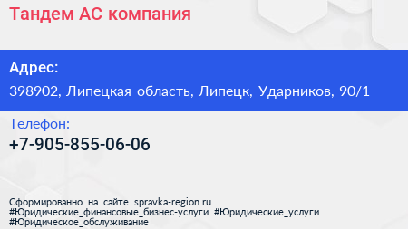 Тандем АС, компания по адресу 398902, Липецкая область, Липецк, Ударников, 90/1 в дальнейшем Организация, размещена в следующих категориях: