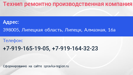 Технип, ремонтно-производственная компания по адресу 398005, Липецкая область, Липецк, Алмазная, 16а в дальнейшем Организация, размещена в следующих категориях: