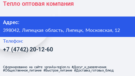 Тепло, оптовая компания по адресу 398042, Липецкая область, Липецк, Московская, 12 в дальнейшем Организация, размещена в следующих категориях: