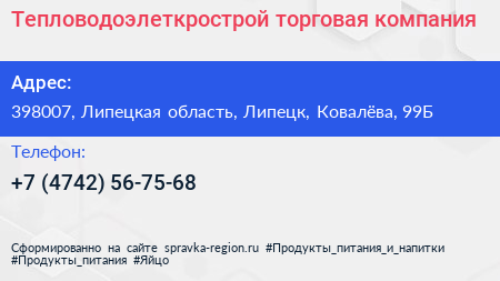 Тепловодоэлеткрострой, торговая компания по адресу 398007, Липецкая область, Липецк, Ковалёва, 99Б в дальнейшем Организация, размещена в следующих категориях: