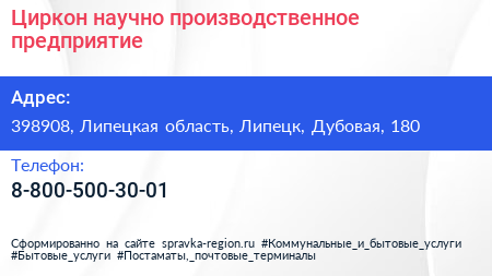 Циркон, научно-производственное предприятие по адресу 398908, Липецкая область, Липецк, Дубовая, 180 в дальнейшем Организация, размещена в следующих категориях: