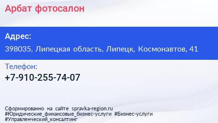 Арбат, фотосалон по адресу 398035, Липецкая область, Липецк, Космонавтов, 41 в дальнейшем Организация, размещена в следующих категориях: