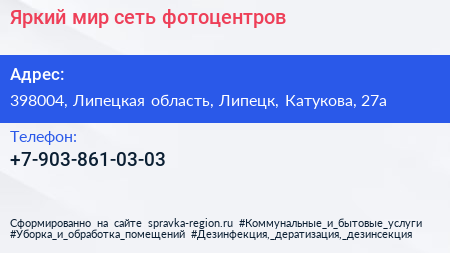 Яркий мир, сеть фотоцентров по адресу 398004, Липецкая область, Липецк, Катукова, 27а в дальнейшем Организация, размещена в следующих категориях: