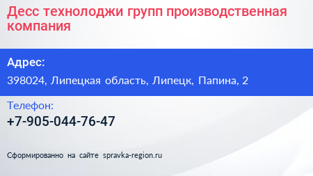Десс технолоджи групп, производственная компания по адресу 398024, Липецкая область, Липецк, Папина, 2 в дальнейшем Организация, размещена в следующих категориях:
