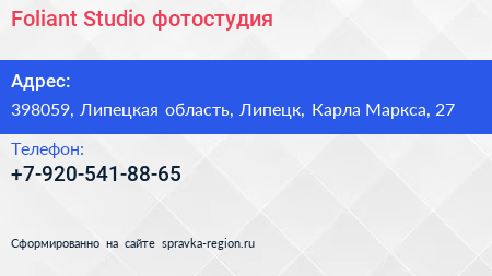 Foliant Studio, фотостудия по адресу 398059, Липецкая область, Липецк, Карла Маркса, 27 в дальнейшем Организация, размещена в следующих категориях: