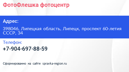 ФотоФлешка, фотоцентр по адресу 398046, Липецкая область, Липецк, проспект 60-летия СССР, 34 в дальнейшем Организация, размещена в следующих категориях: