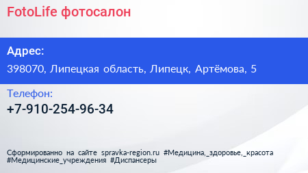 FotoLife, фотосалон по адресу 398070, Липецкая область, Липецк, Артёмова, 5 в дальнейшем Организация, размещена в следующих категориях: