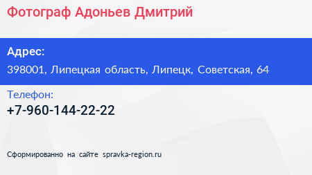 Фотограф Адоньев Дмитрий по адресу 398001, Липецкая область, Липецк, Советская, 64 в дальнейшем Организация, размещена в следующих категориях: