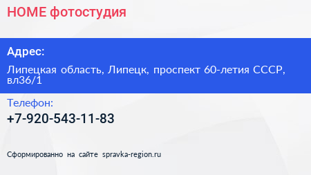 HOME, фотостудия по адресу Липецкая область, Липецк, проспект 60-летия СССР, вл36/1 в дальнейшем Организация, размещена в следующих категориях: