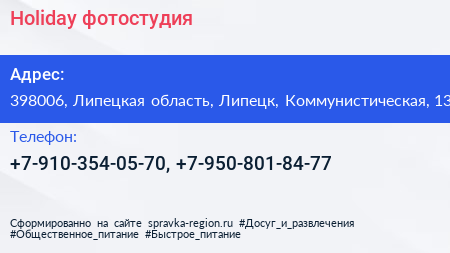 Holiday, фотостудия по адресу 398006, Липецкая область, Липецк, Коммунистическая, 13 в дальнейшем Организация, размещена в следующих категориях: