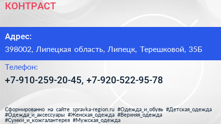 КОНТРАСТ по адресу 398002, Липецкая область, Липецк, Терешковой, 35Б в дальнейшем Организация, размещена в следующих категориях: